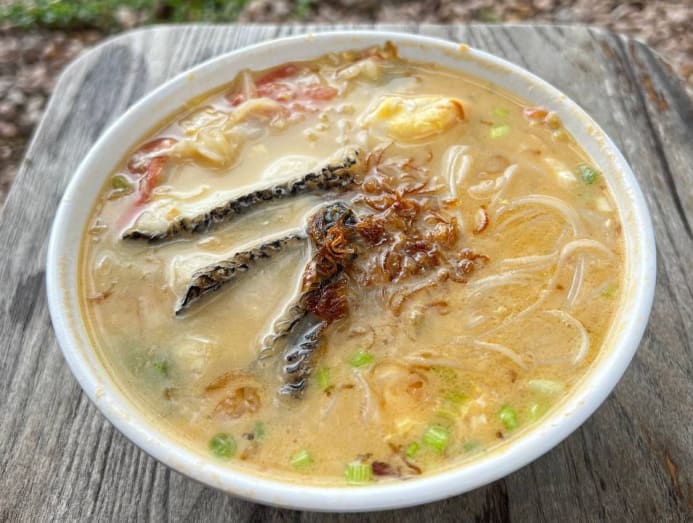 The stall has two types of “Kuala Lumpur-style” fish soup, which we will explain more below. You can choose from boiled or fried snakehead slices, or a combination of both. It is served with thin bee hoon instead of the usual thicker variety, though you can swap it for the latter. Other carb bases like rice or ee mian will cost an extra 70 cents and S$1 respectively.