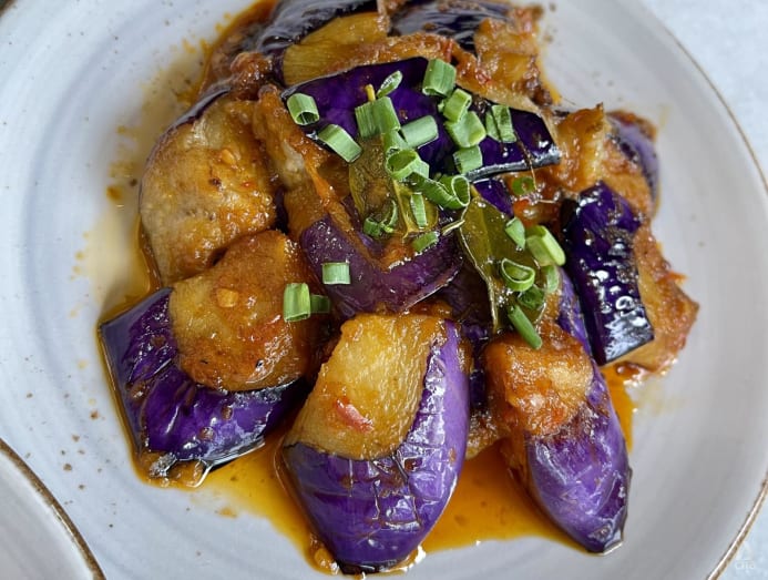 As for the eggplant, it looked very appetising with its vivid purple skin, orange sauce and green spring onions.