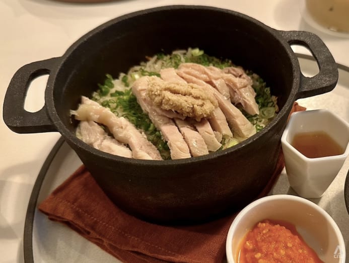 Okay, so it’s an S$18 chicken rice, but it comes piping hot in a little casserole pot, with a tiny cup of concentrated chicken consomme, and it's the dude's family chilli, and who says chicken rice can’t be an occasion?