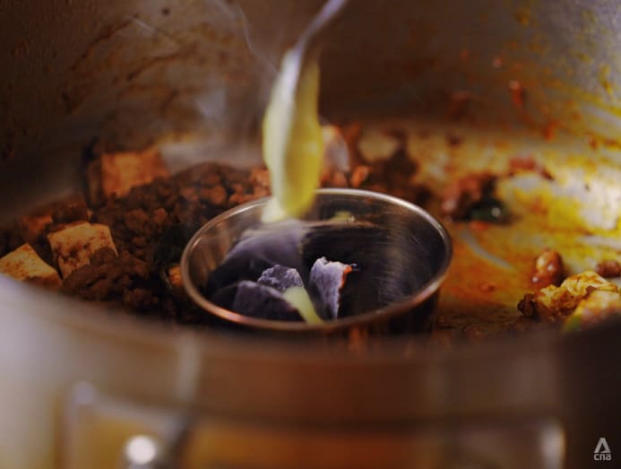 Vasun shows us how a traditional Indian method provides an easy way to "smoke" food, making her dish's flavours more dimensional. (Photo: CNA/Joyee Koo)