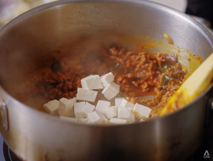 4. Add minced meat and saute until oil separates. Add tofu cubes. Turn off the heat and set aside.