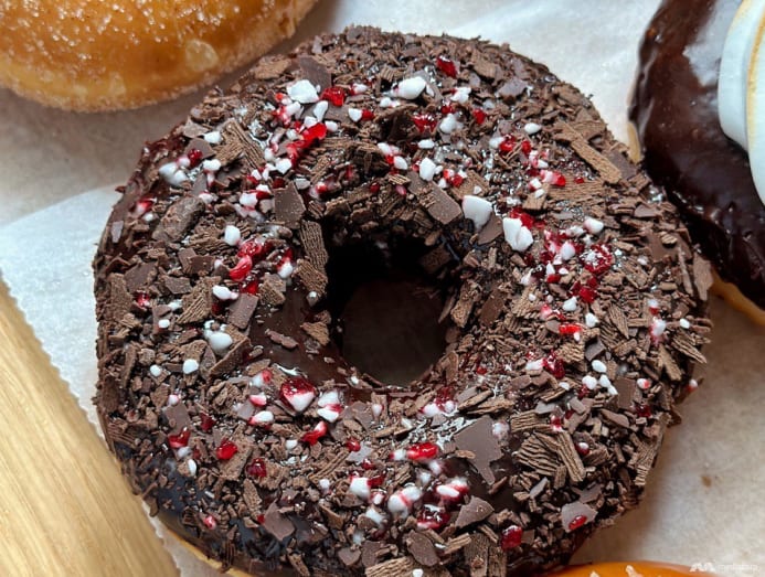This dark chocolate glazed doughnut is sprinkled with bits of crushed peppermint candy cane for a minty hit. It’s more interesting than a regular ol’ choc flavour, but we find this too saccharine for adults. The kids will demolish it, though.