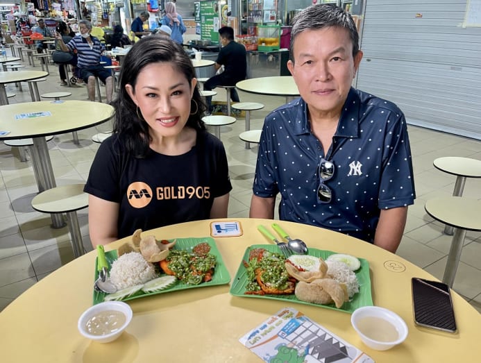 Mediacorp Gold 905 DJ Denise Tan gets in line with the private hire driver who discovered unique green chilli chicken rice at Sims Vista Food Centre, in his childhood neighbourhood.