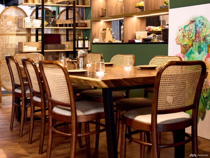 Decked in warm, earthy tones with wooden floors and furniture, the restaurant exudes cosy yet elegant charm. A lush wall of greenery livens up the space, while a striking oil painting of Harummanis dishes adds a pop of colour.