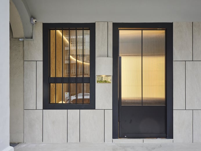 Separating the reception area from the dining room is a black steel and glass paned sliding panel referencing the windows of traditional Korean hanok houses that are made with traditional hanji paper.