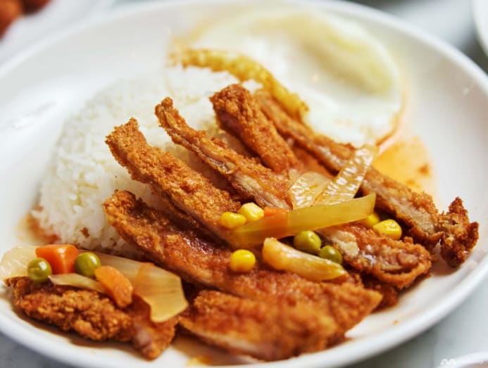 Homey, crispy Hainanese-style pork chop, draped in an onion, carrot and pea gravy and topped with a fried egg. We recommended getting a side of fried ngoh hiang to savour with this tasty, comforting plate.