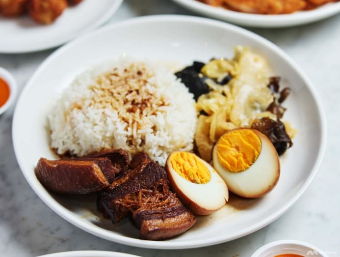 The pork belly rice with a braised egg and heap of Nonya-style chap chye is equally good. The thick slabs of lean braised pork belly are layered with soft, melt-in-your-mouth fat, soaked in a fragrant gravy that’s also poured over the accompanying rice. The heavy flavours are tempered by the punchy chap chye, a medley of crunchy cabbage and black fungus stir-fried with fermented beancurd.
