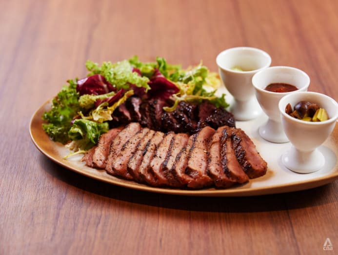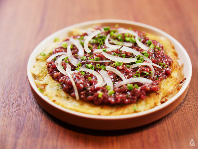 “Unlike the usual or traditional Korean grill experience, at GU:UM, the dishes are prepared with various culinary techniques in addition to a focus on grilling in a modern charcoal grill in the open kitchen,” Han, who is originally from Korea, told CNA Lifestyle. “We just want to have fun and play with fire – safely! – while cooking satisfying dishes for our guests.”
