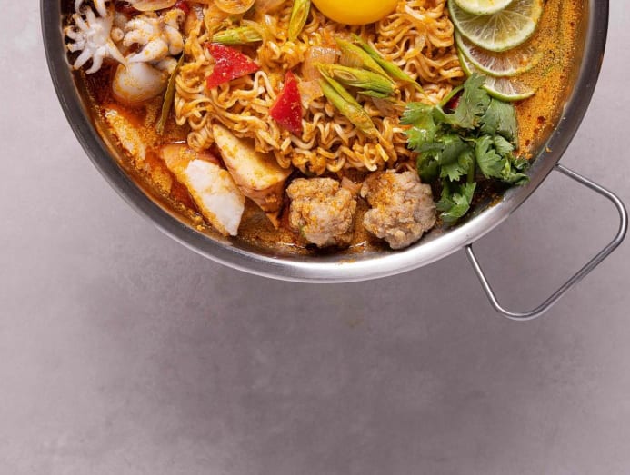 This is served hotpot-style. Think tom yum soup pimped up with mussels, prawns, squid and fish cake, alongside a heap of the well-loved Thai Mama brand of instant noodles and two eggs.