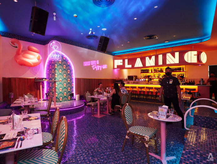 Located at Raffles City Shopping Centre in the space formerly occupied by Marche, Tipsy Flamingo features tropical beach and pool themed decor, dishes with a local twist and even a little stage for live music.