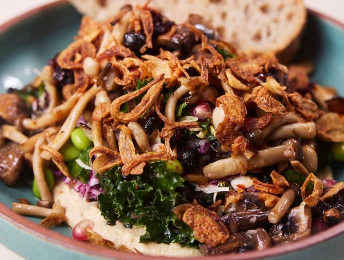 A mix of sauteed mushrooms, kale, quinoa, edamame, and crispy shallots sits atop a generous smear of house-made chickpea hummus – earthy, creamy, and full of flavour. It’s comforting in a familiar, Asian-inspired way, making it a light yet satisfying lunch option. Each bowl comes with a side of the bakery’s toasted sourdough, which is chewy, slightly tangy, and perfect for scooping up every last bit.