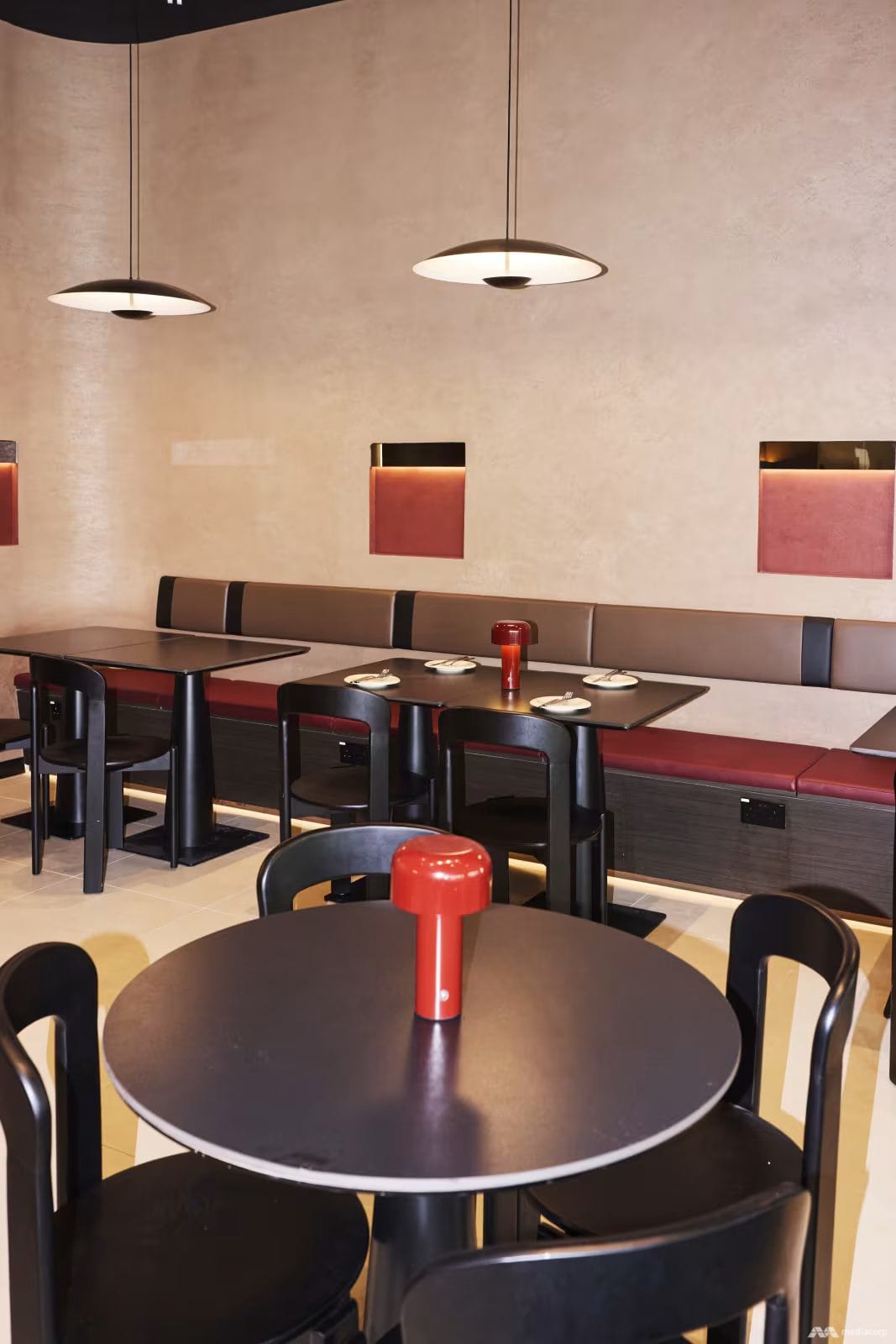 When 8days visited the cafe for a sneak peek, some finishing touches were still underway – but the layout was already taking shape. Furnished in an earthy palette with burgundy accents, the space is calm and understated, with black tables and chairs adding a contemporary touch.