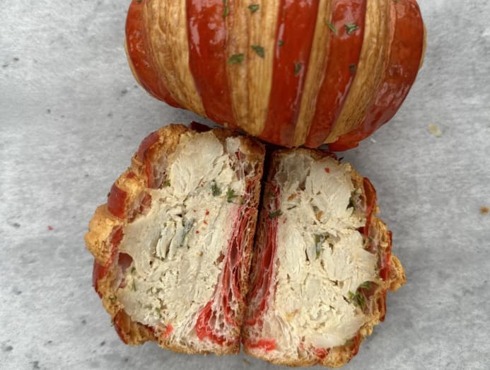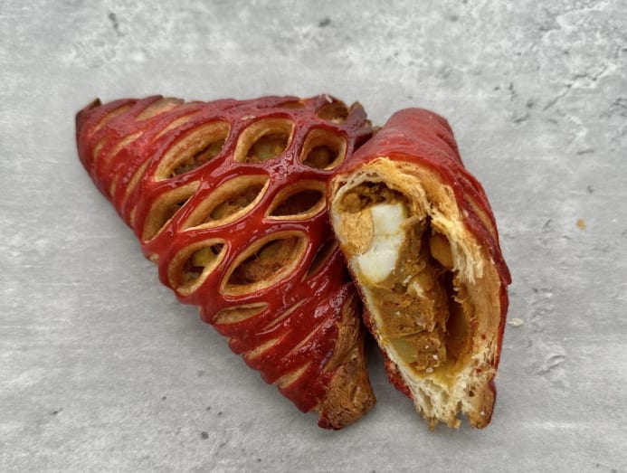 For this luxe croissant, crabmeat is dressed with salted egg, butter and blended curry leaves and added to a bicoloured croissant shell.
