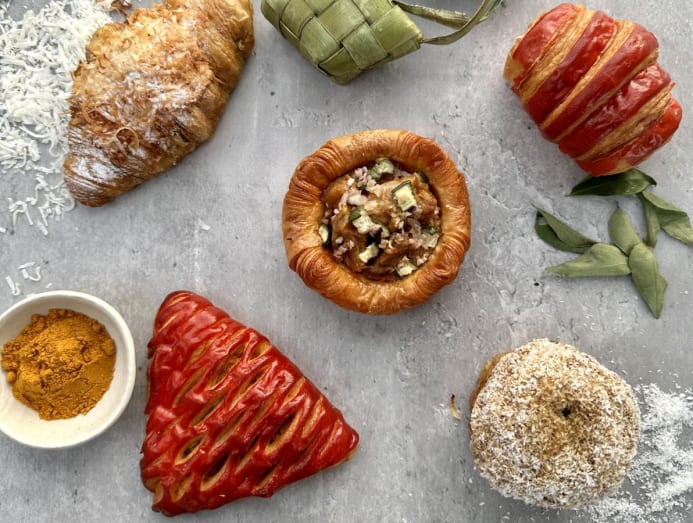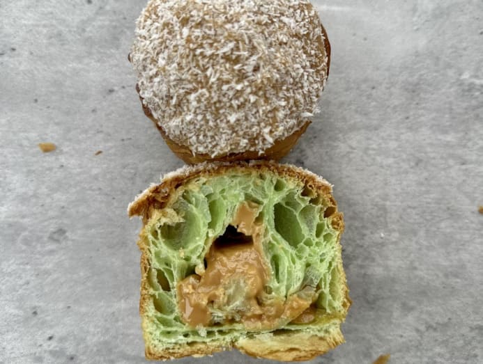 Inspired by ondeh ondeh, this croffin-shaped pastry has a “pandan-flavoured croissant base” loaded with gula melaka custard and sprinkled with desiccated coconut.