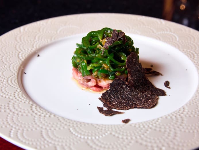 At the same time, he incorporates modern techniques, like applying a low-temperature sous vide method to A5 Miyazaki Wagyu beef sirloin before stir-frying it in a dish of beef with Japanese green peppers.