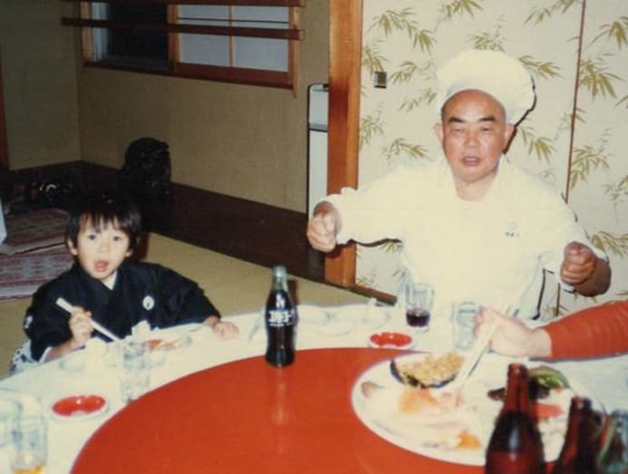 A young Chen Kentaro with his late Iron Chef father, Chen Kenichi (left) and Hui Guo Rou at Shisen Hanten. (Photos: Chen Kentaro, CNA/Dillon Tan)