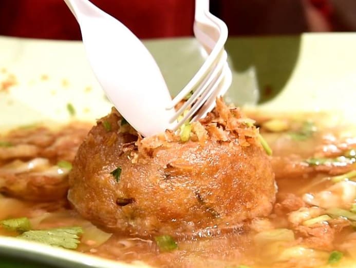 Another heritage brand here is Alhambra Satay, known for being part of the original 1960s Satay Club. And apart from expertly marinated, hand-cut satays, they offer an exclusive dish here: The kentang ball, a fluffy potato sphere filled with minced beef, fried and sitting in a moat of savoury soto ayam.