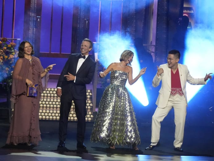 Three of the four mocked creator and producer Lorne Michaels in the audience, who they claimed was nominated and lost 85 times at the Emmys. Rudolph said he was “robbed.” Yang said “It gets better” and “Keep winning”. Meyers corrected them all to say that, in fact, Michaels has won a boatload of Emmys. Yang then leaned into mispronouncing his boss' name.