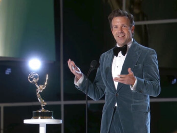 And what did “Ted Lasso” himself wear? Jason Sudeikis, without his character's signature porn 'stache, showed off his Eazy-E socks tucked under a velvet suit of powder blue by Tom Ford.