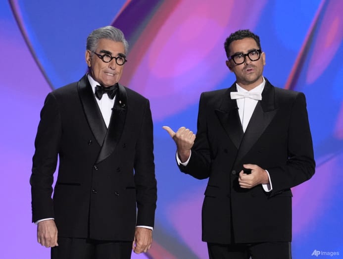 The father-son hosting duo of Eugene and Dan Levy in their monologue at the top of the show mocked the very dramatic The Bear being in the comedy category.