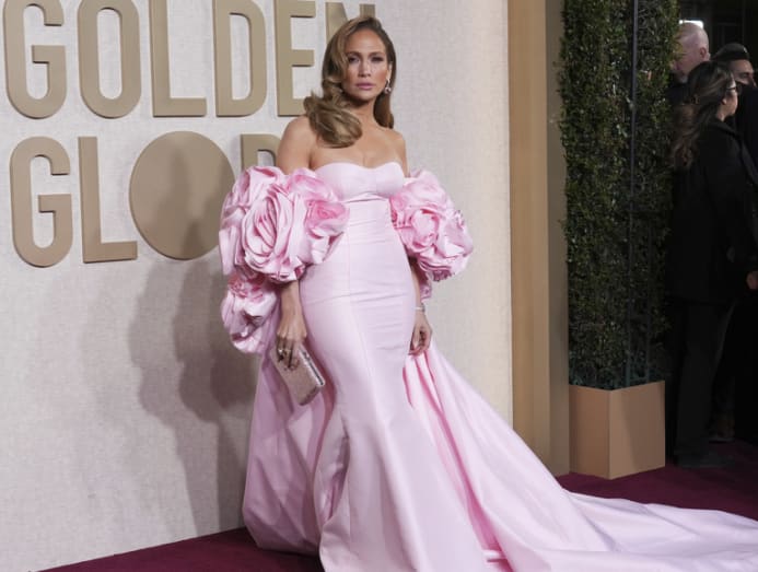 Jennifer Lopez also went Old Hollywood in strapless light pink with huge floral sleeves by Nicole + Felicia Couture.