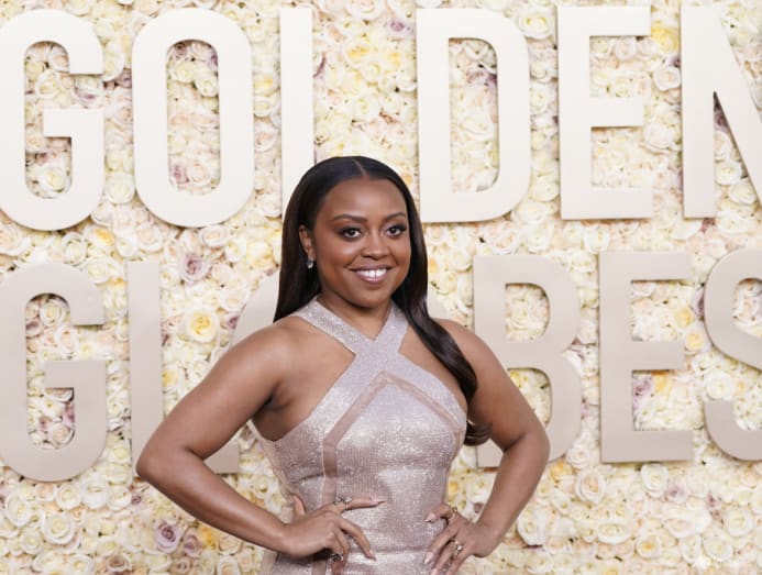 Quinta Brunson, often a fashion standout, wore a Balmain gown in champagne that fell to her ankles with a crossover neck and an understated sparkle.