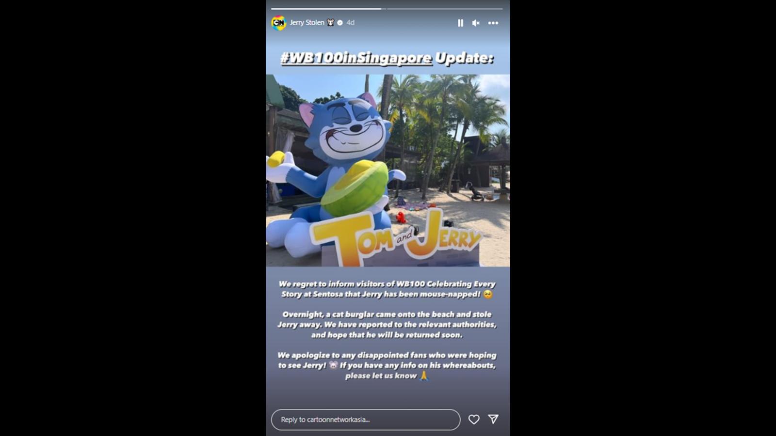 It’s not a publicity gag: Jerry has apparently been mouse-napped. One half of the famous Tom & Jerry duo – or rather, its inflatable – went missing from Sentosa’s Siloso Beach on Sunday (Nov 12). A missing mouse report has been made on the 1.5m-tall Jerry mascot.