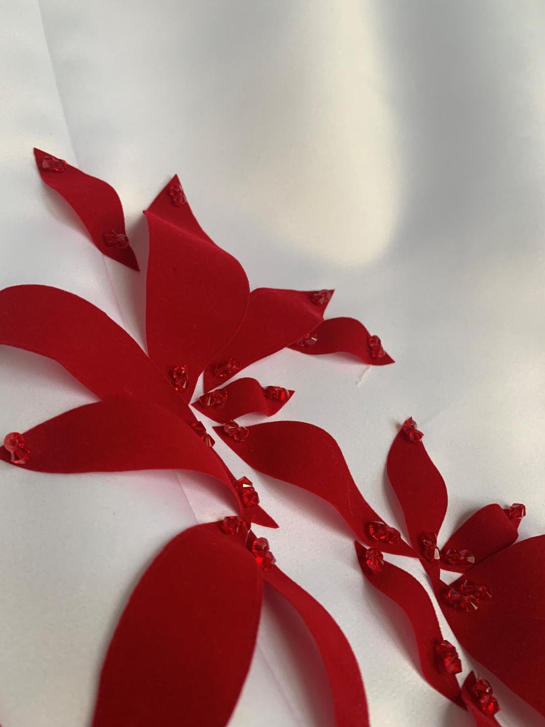 When Hong turns around, things get more dramatic: The back of the gown was “a tribute to the Singapore flag, with red embellishments such as hand-sewn leaf-shaped velvet cut-outs, accented by thousands of red Swarovksi crystals.”