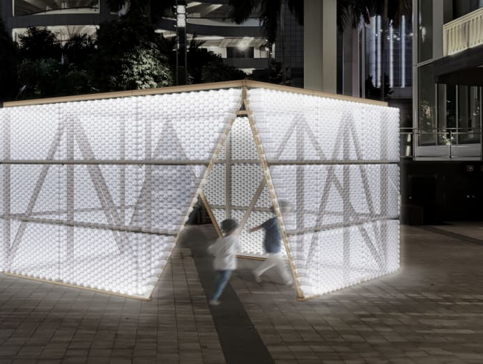 The Lantern is a luminous pavilion made out of over 5,000 upcycled plastic water bottles. Designed by Josephine Pun Tsz Kiu from the National University of Singapore, it symbolises renewal while serving as a reminder of the waste we generate.