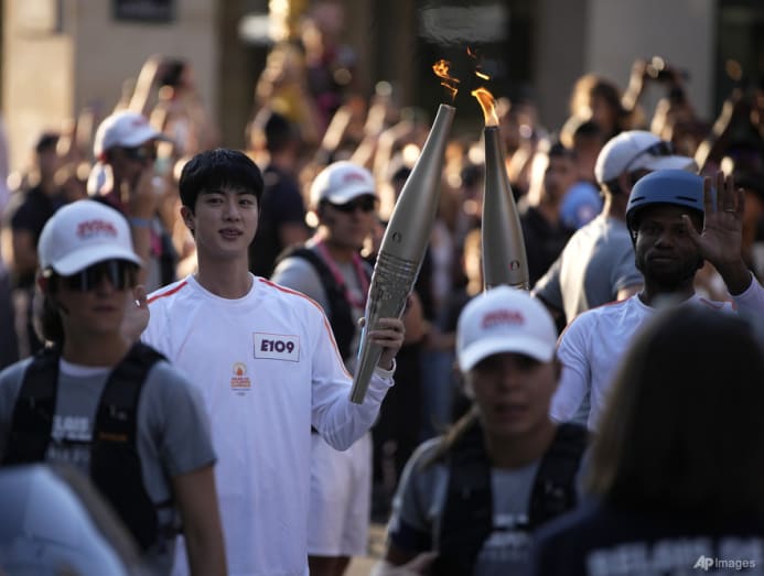 BTS member Jin carries Olympic torch in Paris near Louvre Museum