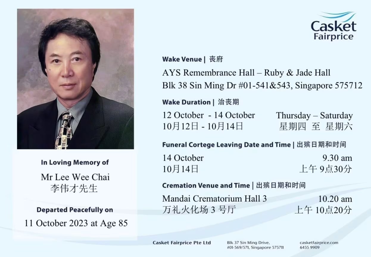 Her late husband, Anthony Lee, died on Oct 11 at the age of 85.