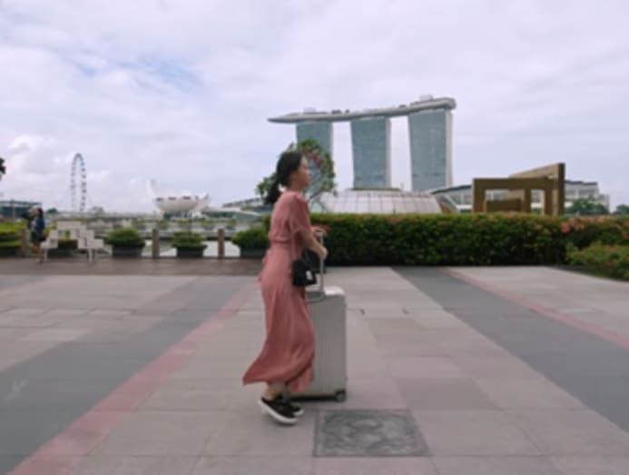 After her exit from Expo MRT station (go figure), the actress lugs her luggage with what is arguably Singapore’s representative skyline behind her.