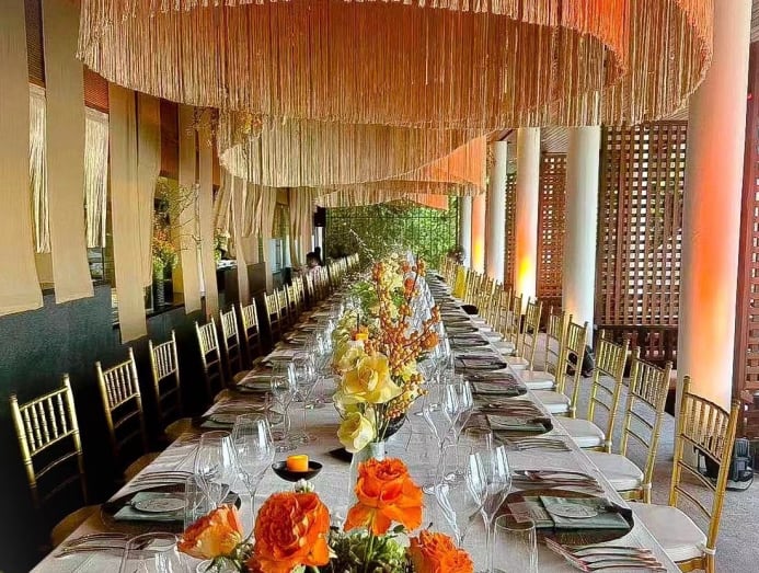 The green and peach-themed venue was adorned with long tables and breathtaking decor, including tassels and flower arrangements hanging from the ceiling.