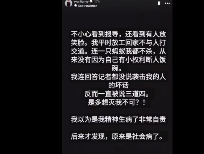 Actor Ryan Lian addresses netizens who mocked him after being slashed: 'How badly do you all want to destroy me?'