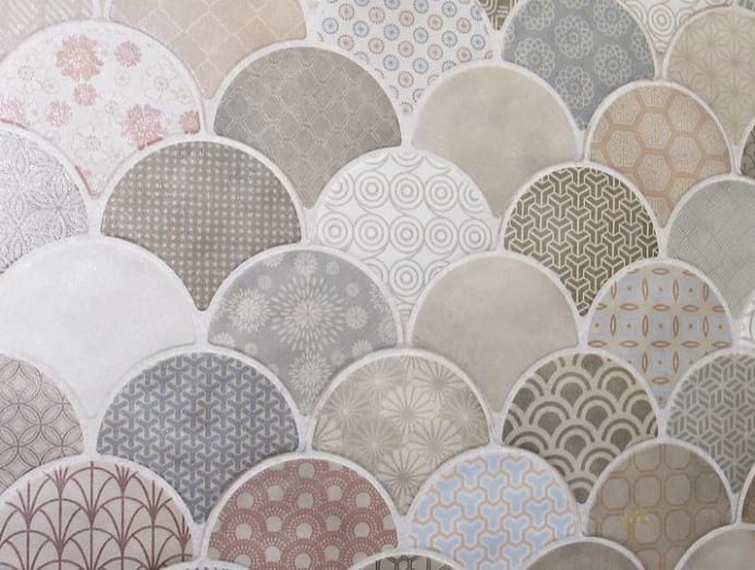 The common bathroom draws heavily from both Japanese and Peranakan aesthetics, thanks to earth-toned multi-patterned fish-scale wall tiles, and honeycomb-shaped floor tiles in muted grey. A deep blue under-sink cabinet with vintage crackle-glazed porcelain knobs adds a charming finishing touch.
