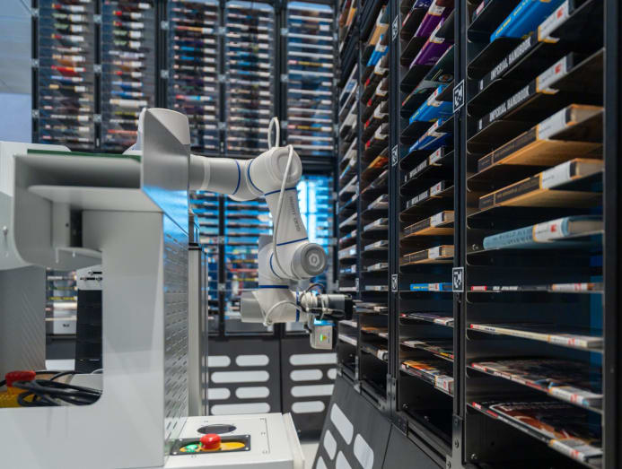With the automated book retrieval system, patrons can select the titles through a touch-screen kiosk and a robotic arm will locate and transport the selected items to a collection point for easy pickup.