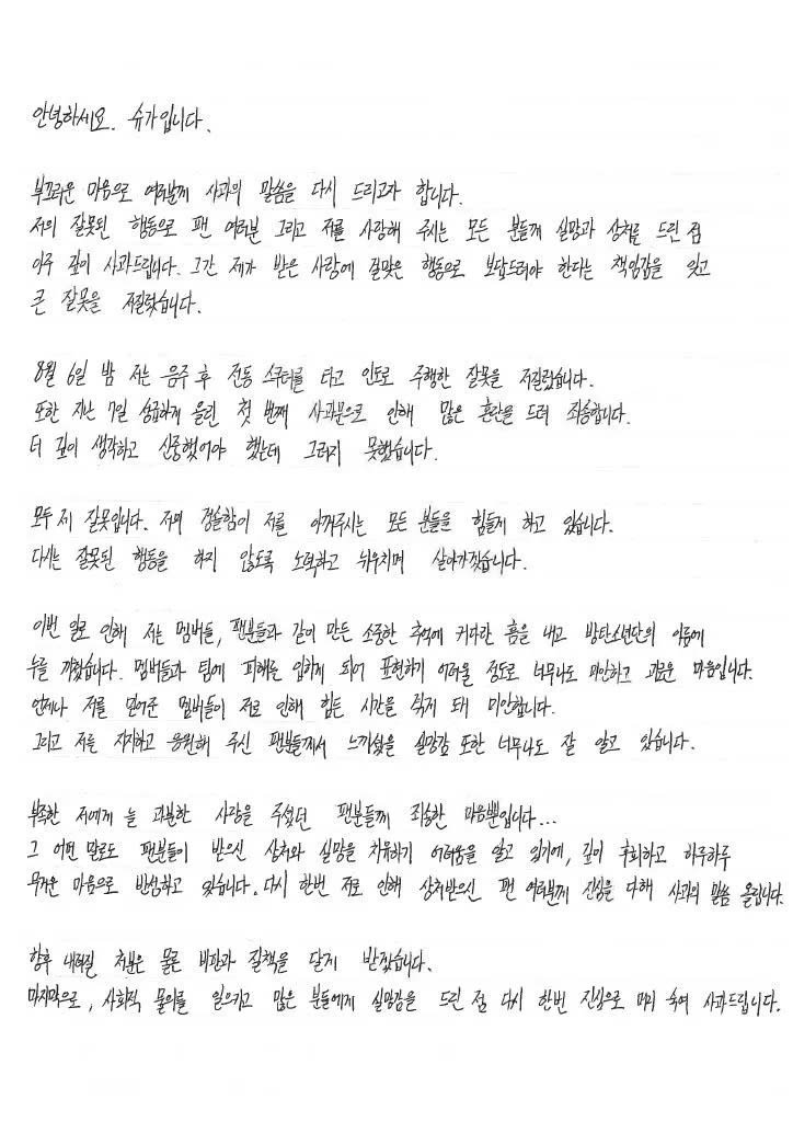 Suga, a member of the K-pop group BTS, has posted a handwritten apology letter for his recent drunk driving incident in Seoul.