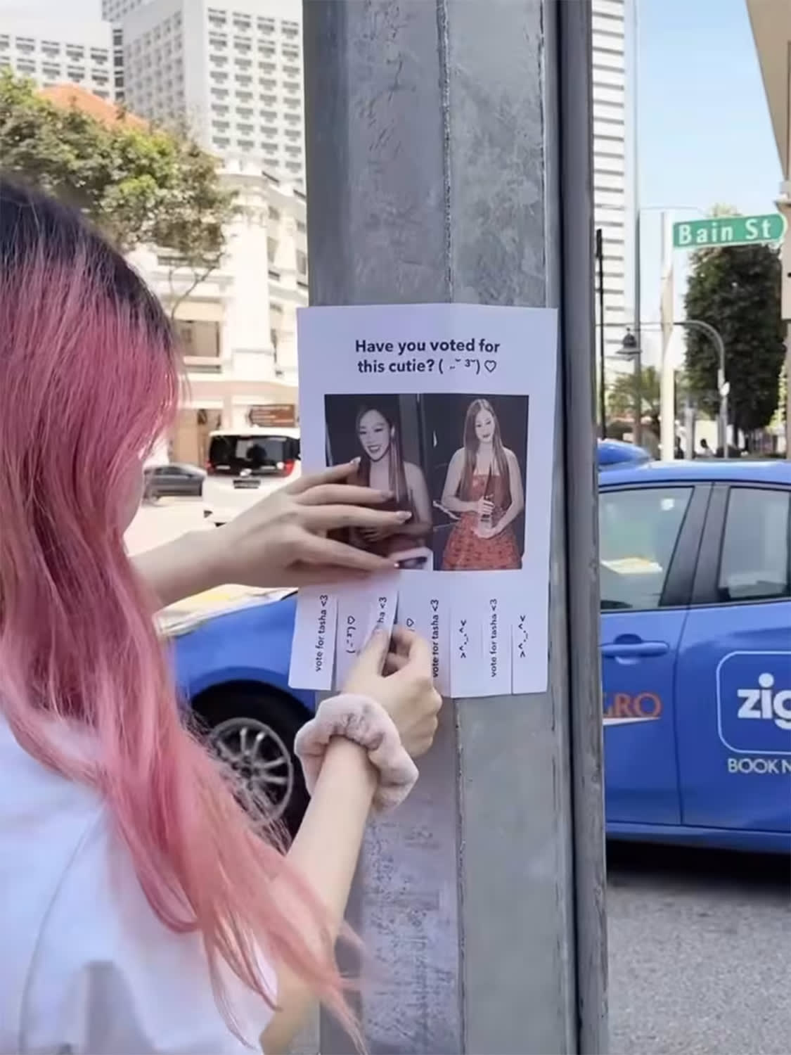 The posters included this message: "Have you voted for this cutie?" and a photo of the Emerald Hill star.