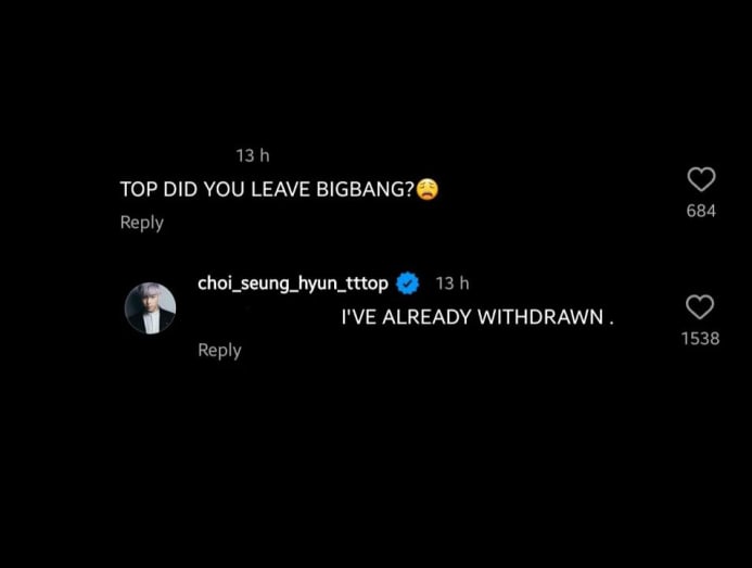 TOP proceeded to reply with “I’VE ALREADY WITHDRAWN” – prompting a flood of comments from shocked fans. In a now-deleted comment, TOP elaborated: “I’VE ALREADY TOLD YOU GUYS THAT I’M LEAVING AND I’M NOW FACING A NEW CHAPTER IN MY LIFE LAST YEAR.”