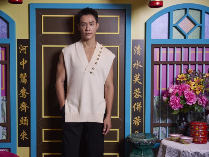 The 27-year-old Mediacorp actor is the only cast member not dressed in a suit. Instead, he is in a casual cream-coloured knit top that shows off his muscular arms and defined chest.