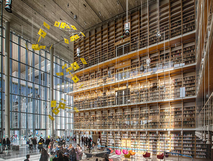 It is a public building with many spaces that can be enjoyed without a fee including multiple viewing spots at the tip. From this high point, one can amble down the sloped roof of the library with a sprawling garden, filled with indigenous plants and herbs like oregano, thyme and rosemary.