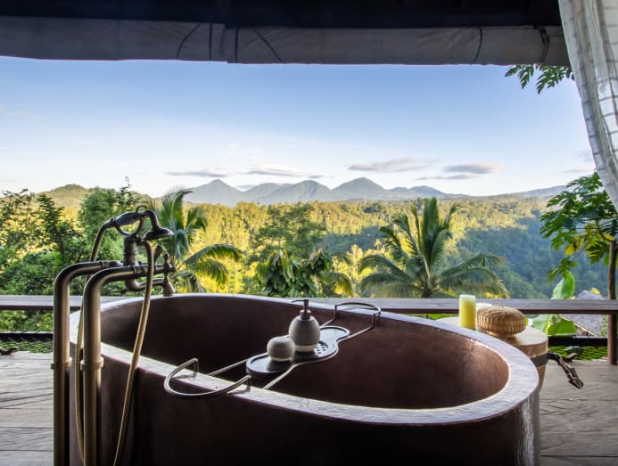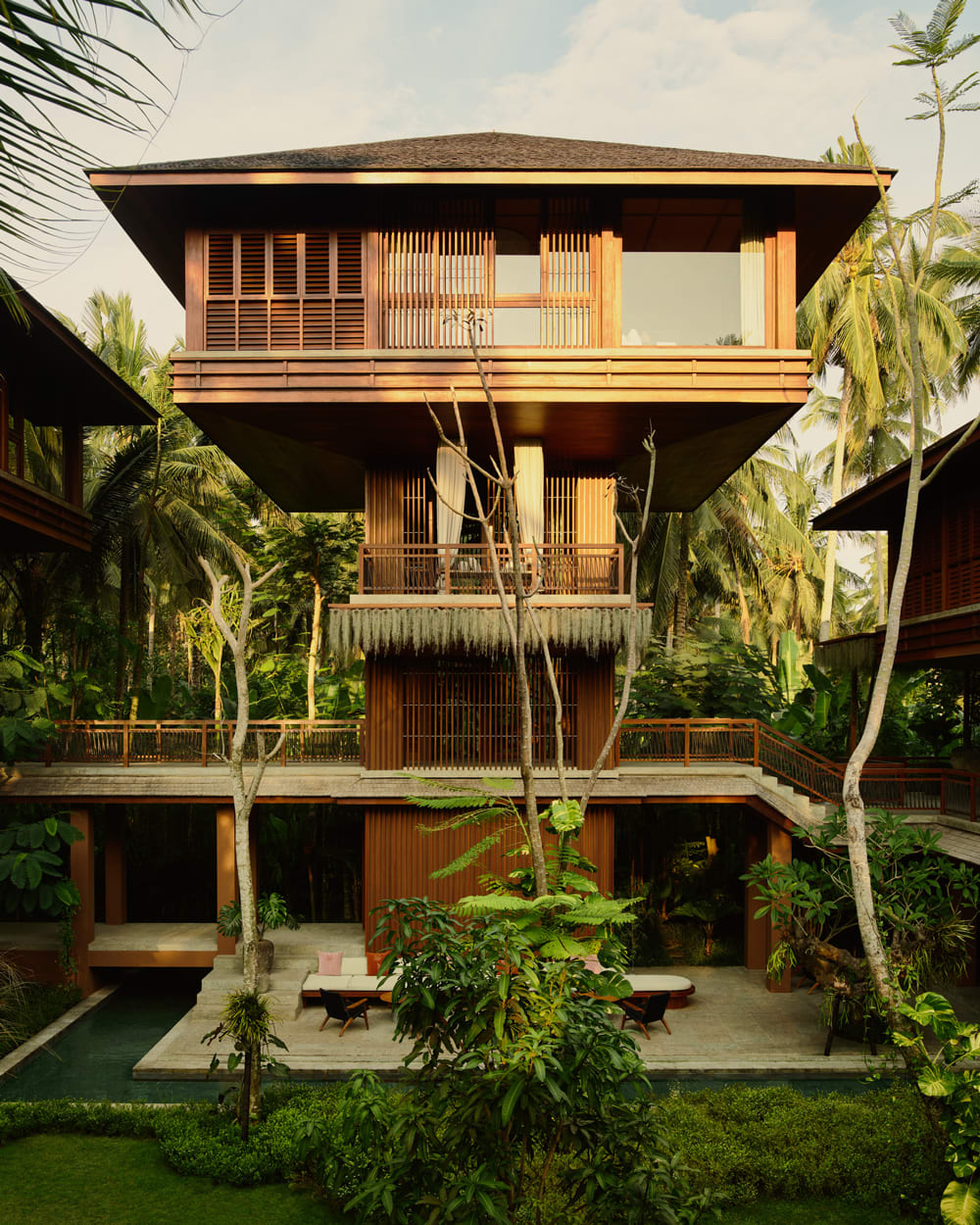 The resort’s architect duo, Dharmali Kusumadi and Gede Kresna, took their inspiration from bale, a common traditional hangout hut for villagers. Each structure is made almost entirely of wood, especially ironwood, which is famously known for its sturdiness against wet weather. The roof is supported by thick pillars with nothing in between except for white transparent curtains – a deliberate setting to evoke, as Buahan puts it, a naked experience. Each villa comes with a private pool, a chopper bathtub, and a huge mattress enough to accommodate three people.