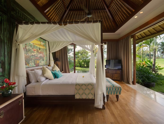 That alluring setting is matched with extensive facilities for an independent villa. It has a 25m infinity pool, a grass tennis court, a mountain-facing bar, and a Moroccan-style indoor cinema. Catering to big groups and families, the eight-bedroom compound is served by a good ratio of crew members: 24 people, including four butlers and an in-house chef specialising in Indonesian dishes. It might be safe to say that Kaba Kaba Estate has secured a spot in the top league of luxury private villas in Bali.