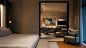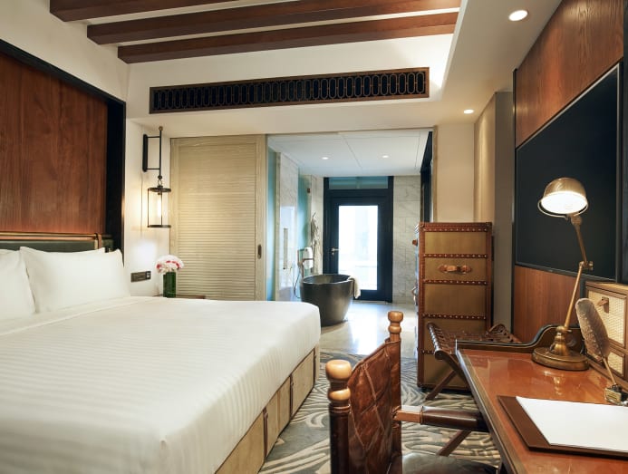 The design of the room pays homage to the building’s rich history. Furnishings are inspired by original pieces once used by the military. These include a vintage-looking desk and a mini bar reminiscent of a travel trunk, as well as timber sliding doors separating the bedroom from the bathroom.