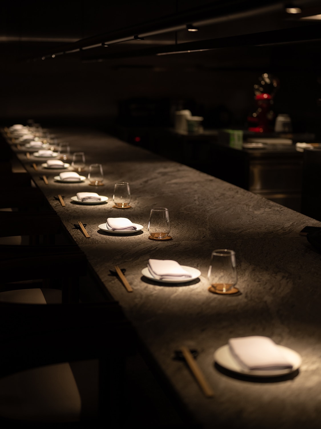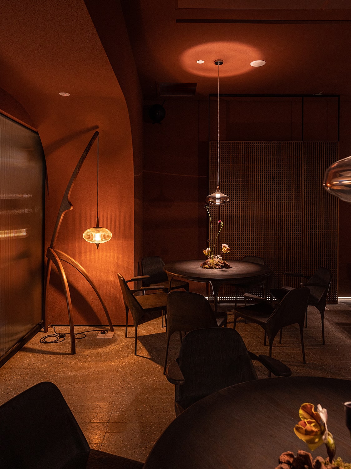 Its focal point is the bar, which is highlighted by a diffused amber backlight, resembling the colour of a sunset. This creates a contemplative atmosphere, encouraging customers to savour the desserts and appreciate the beauty of such fleeting moments, much like a sunset.