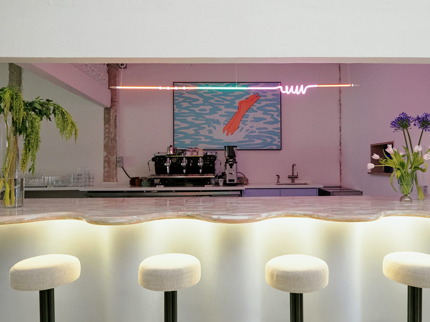 It’s as relaxed and offbeat as its owners, the duo behind design and branding collective Studio Kanta, Adrien Kent and Suek Mei Chai, and a culmination of their personalities. A bit whimsical and wacky, revel in the David Hockey-esque colour palette, a scallop-edged bar and cheeky details.