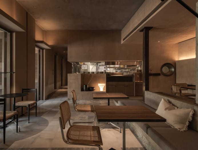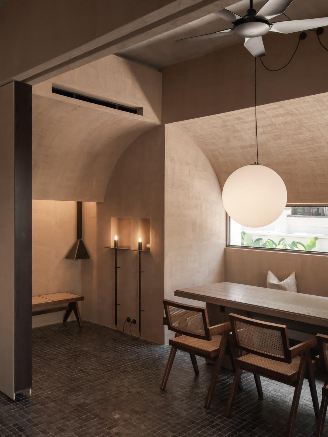 The skill lent itself well to this bright, restful restaurant within a lush greenery landscape with plenty of outdoor seating and a cosy outdoor bar. Wood detailing and exposed bricks make a pleasing background populated by neutral-hued furniture in tactile fabrics, rattan chairs and sculptural wooden lighting