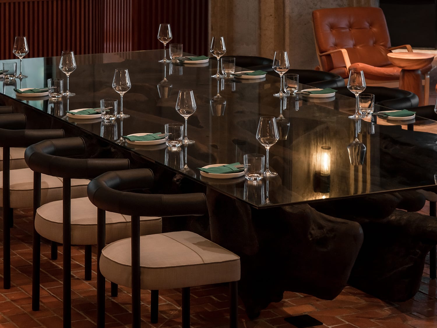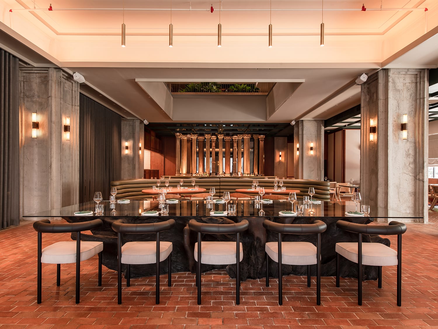 The dining area is backdropped by a bar featuring distressed Roman columns, a quirky detail which adds drama and presence to this stylish space.