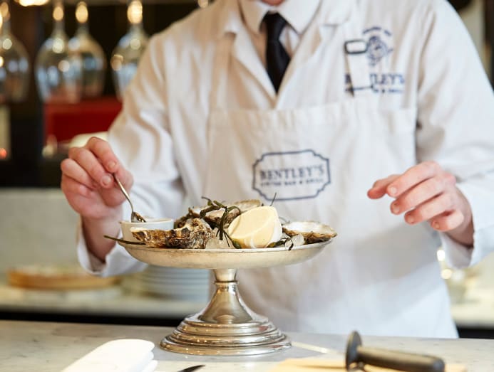 Enjoying oysters and champagne at Bentley’s Oyster Bar & Grill is one of my favourite things to do, particularly when wild, native UK oysters are in season. The time to eat them is during any month with the letter R in it (September through April). In summer months, the water is too warm and the oysters breed, but when the water is a bit colder, that’s the time to eat those native oysters. They each taste differently, depending on which region they come from. I always sit at the bar at Bentley’s and chat to the people working behind it who are opening the oysters. They tell you which ones they think are the best at the moment. A glass of champagne always accompanies that.
