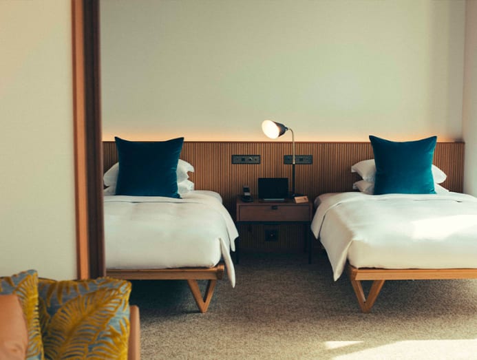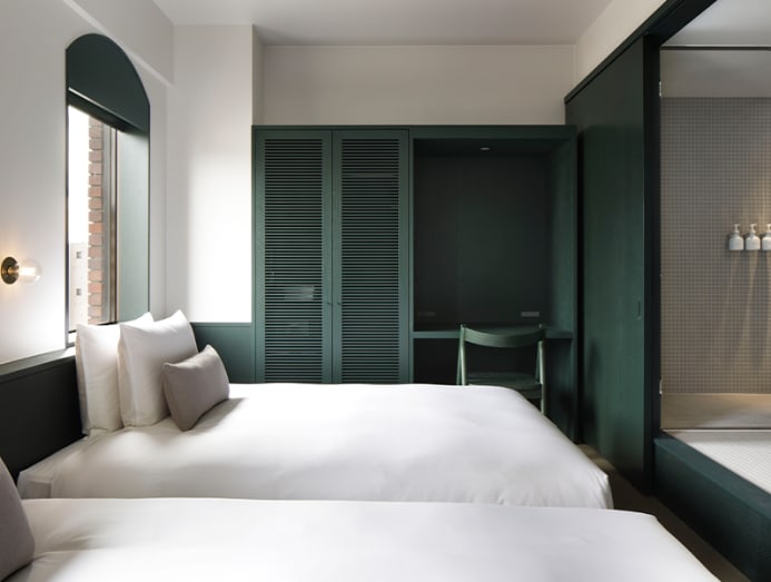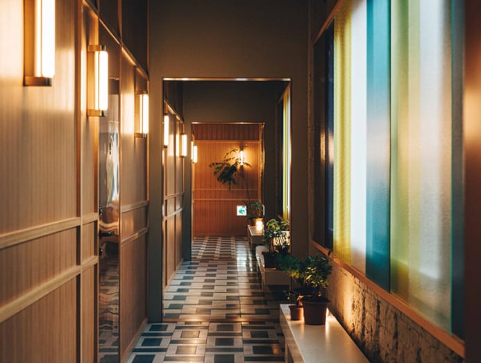 Case-Real retained the original facade’s arched windows and bricks. Mosaic tiles, moss green colour brass elements give the hotel an understated feel with plenty of tactility. The second-floor reception has picture windows framing street views. Formerly a level for guestrooms, it is now the hotel’s social space with a cafe called Abno and Phase Music Bar & Lounge with occasional live performances.